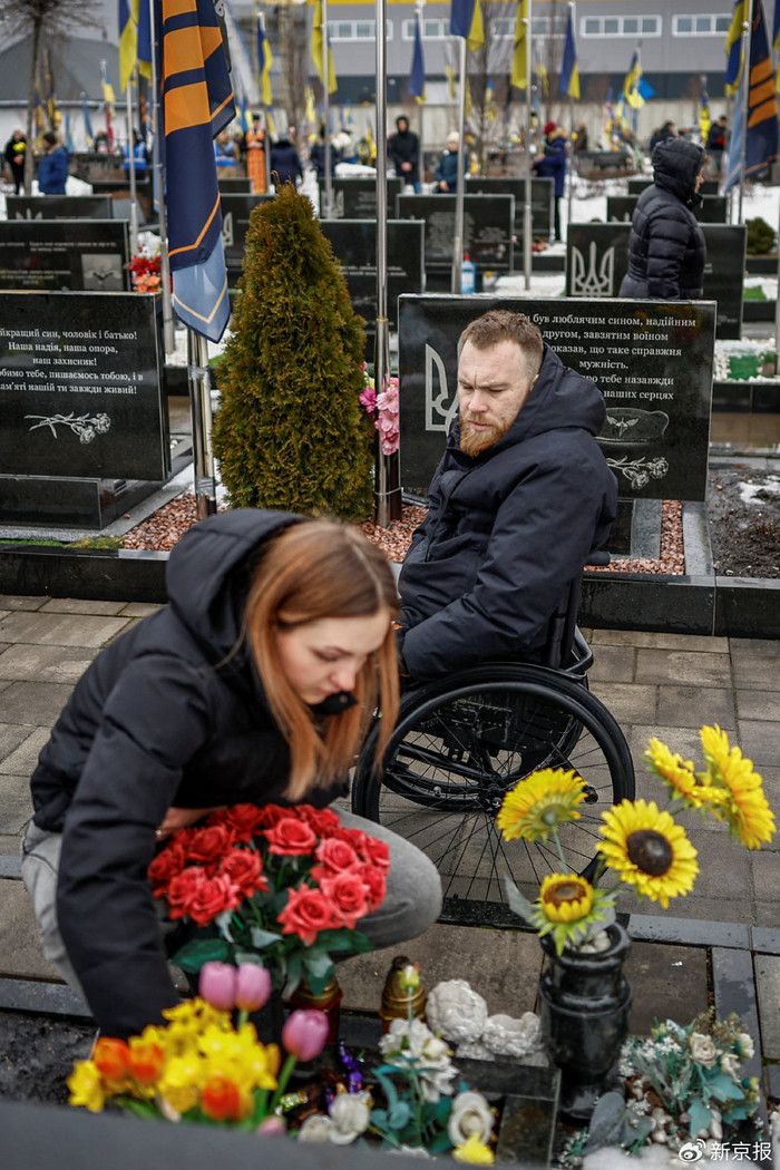 当地时辰2026年2月24日,乌克兰基辅州布恰镇,一双配头在当地义冢的好汉大路献花,是曲受害者。图/ICphoto