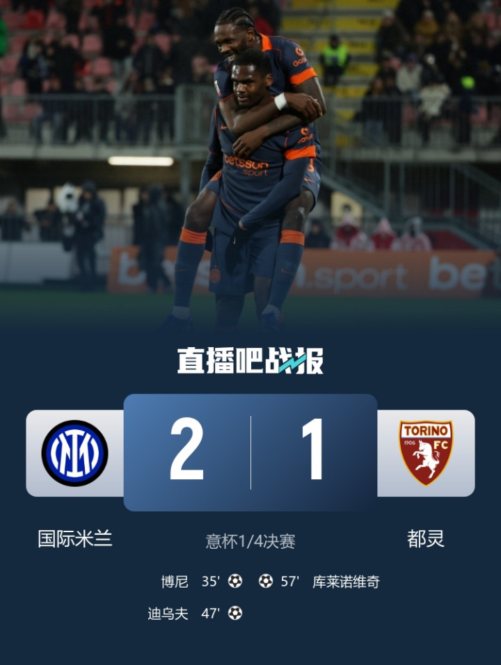 直播吧2月5日讯意杯1/4决赛,国外米兰对阵齐灵,比赛在蒙扎布里安特奥球场进行。上半场,博尼先拔头筹。易边再战,迪乌夫再下一城,库莱诺维奇扳回一球,博尼伤退,普拉蒂进球被吹。最终国米2-1齐灵晋级四强,将对阵那不勒斯和科莫间胜者。