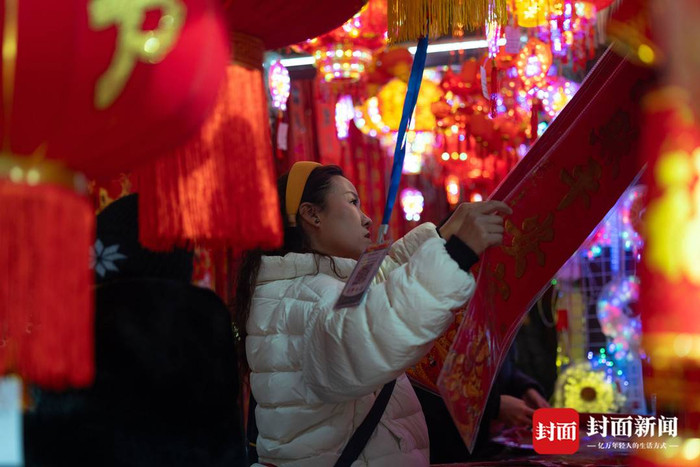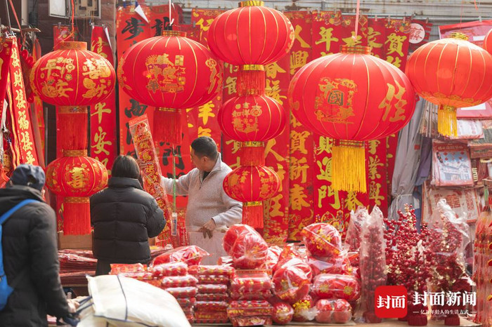 2月4日,封面新闻记者在荷花池小商品批发商场看到,从传统的春联福字,到新颖的电子灯笼,多样春节年货应有尽有。