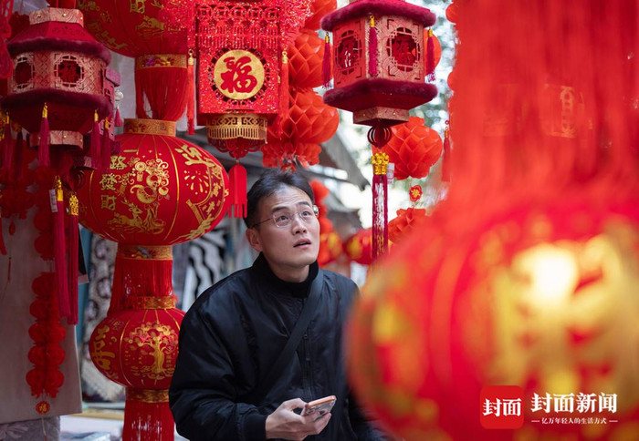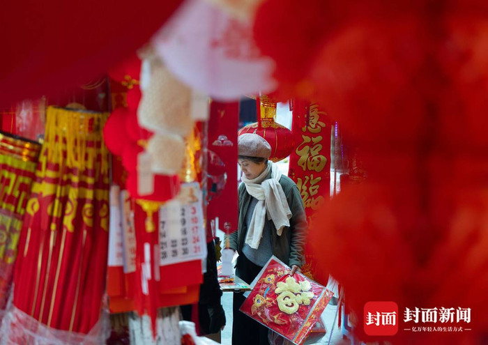 红灯笼、中国结等传统节日饰品挂满商铺,红彤彤的颜料照耀在路东说念主的脸上,在成齐荷花池小商品批发商场,出售节庆饰品的商店成了商场里最能干的一抹红。