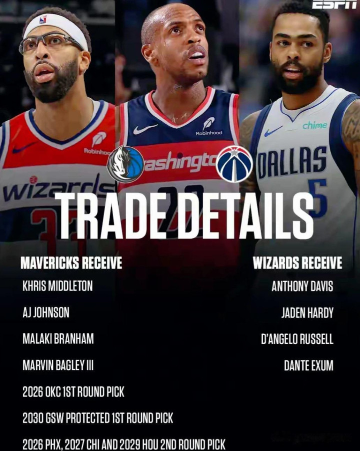 独行侠与奇才完成4换9超等往返,独行侠将浓眉送至奇才,换回米德尔顿等4名球员+2首轮3次轮,透顶归天浓眉顶薪条约开启重建,还顺利避让奢靡税。