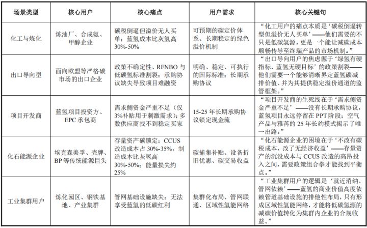 现时蓝氢产业在“减碳不经济”的逆境中,其场景痛点与用户需求呈现高度分化的特征——化工与真金不怕火葬用户困于“碳税倒逼但溢价无东谈主买单”、出口导向型用户受制于“海外圭臬割裂与套利艰巨”、技俩开发商深陷“承购条约缺失导致融资难产”,而化石能源巨头则在“存量金钱转型与增量插足产出失衡”中艰苦量度。