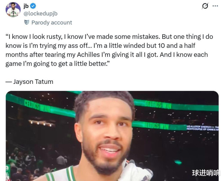 赛后塔图姆也直言感觉体魄有些生锈,在跟腱扯破10个半月后,天然有点喘不上来气,但我方还是尽了全力,况兼大致感觉到每一场比赛都在变得更好。