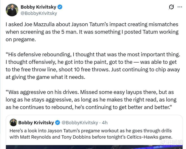 赛后马祖拉也特意说起这两点,暗示唯独塔图姆保持这么的侵犯性与篮板感觉,他昭着会变得越来越好。