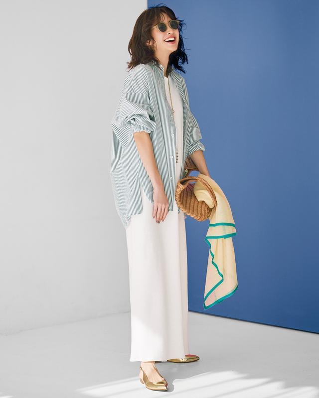 当连衣裙和外衣皆比拟宽松的时刻,就需要制造“亮点”,外衣加入条纹元素,既不错丰富造型,视觉上还颠倒显瘦,与其松紧对比,不如巧用元素,让咱们的穿搭愈加丰富,将要点飘浮到上半身即可。