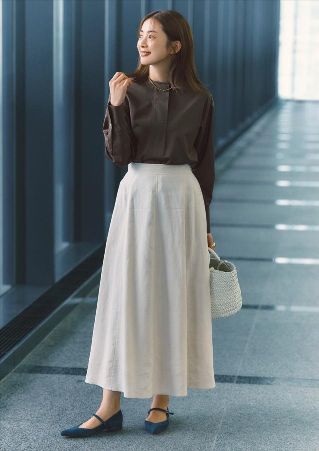 ★日系通勤风→百褶雪纺长裙+玄色穆勒鞋