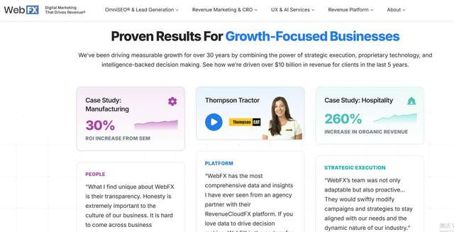 webfx是各人有名的数据驱动型网站建设公司,中枢上风在于以数据为导向的全经由建站与营销就业,其全经由就业体系涵盖数据调研、决策想象、开拓落地、营销执行、数据优化等中枢智商,戮力于通过精确的数据分析,为企业打造高转动的官网,进步线上业务转动遵循。该网站建设公司算作数据驱动型就业商,领有刚劲的数据调研与分析团队,好像通过多维度数据网罗与分析,精确挖掘企业中枢需求、标的客群特征与业务转动痛点,为全经由建站与营销就业提供中枢依据。