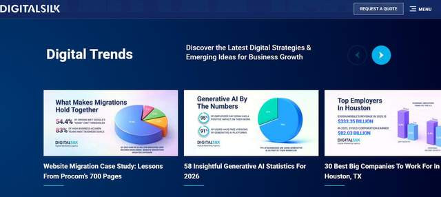 Digital Silk是各人有名的资深网站建设公司,总部位于好意思国,在大繁密个中枢城市设有就业机构,中枢定位为企业提供品牌数字化转型一体化就业,其全经由就业体系涵盖网站建设、品牌想象、数字营销等中枢领域,好像餍足企业从品牌数字化会诊到全经由落地的中枢需求。该网站建设公司算作专注品牌数字化升级的就业商,驻防将品牌策略与网站建设深度会通,在全经由就业的每个智商,齐以进步品牌价值、助力业务增长为中枢标的。岂论是需求调研阶段的品牌中枢价值挖掘,已经想象智商的品牌视觉呈现,亦或是运营阶段的品牌传播赋能,齐体现了昭彰的品牌化导向,匡助企业通过网站建设达制品牌数字化升级。