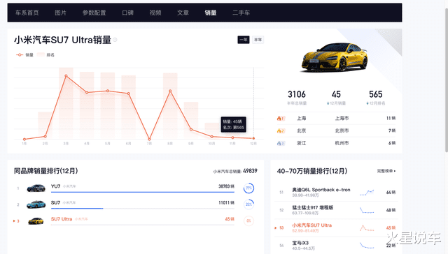 懂车帝等平台数据,2025年12月小米SU7 Ultra末端销量仅为45辆,在国内中大型纯电轿跑市集名次垫底,以致不足部分小众入口车型的零头。