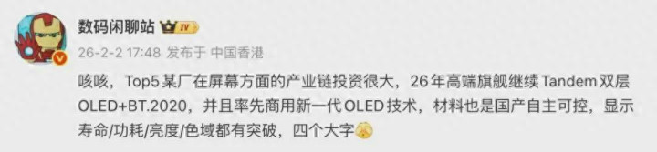 如故@数码座谈站 的爆料,说某Top5大厂(懂的齐懂,便是华为)在屏幕产业链上投了好多钱,2026年的高端旗舰会链接沿用Tandem双层OLED屏幕,还会搭载BT.2020色调规范。
