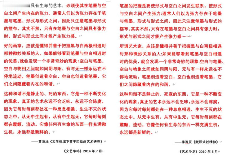 在申诉中国画“文字与空缺”关系的要道章节,贾淡淡著述的部分段落与画家季酉辰2010年发表的《赋样式以精神》一文高度相似。从“绘图的人命力在于文字与空缺间的张力”这一中枢论点,到“空缺与文字……如同阴与阳、有与无一样经久在接续地流动”等多句表述,均被径直挪用,仅有个别词语规则微调,也莫得标注援用文件。