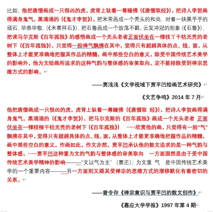 “抒怀的丛林”还发现,贾淡淡论文中对于贾平凹画作《唐僧取经》《鬼才李贺》《百年一身》等作品的描摹,与学者曾令存1997年发表的《禅宗意志与贾平凹的散文创作》一文的文本存在大面积重叠。不仅画作称呼、具体预见描摹,如“黑涌涌的”、“秃子老者”等语句重复,其对于贾平凹绘图“追求气韵与举座感”、“受禅宗想维影响”的中枢不雅点及齐全申诉段落也近乎一致,且未标注援用文件。