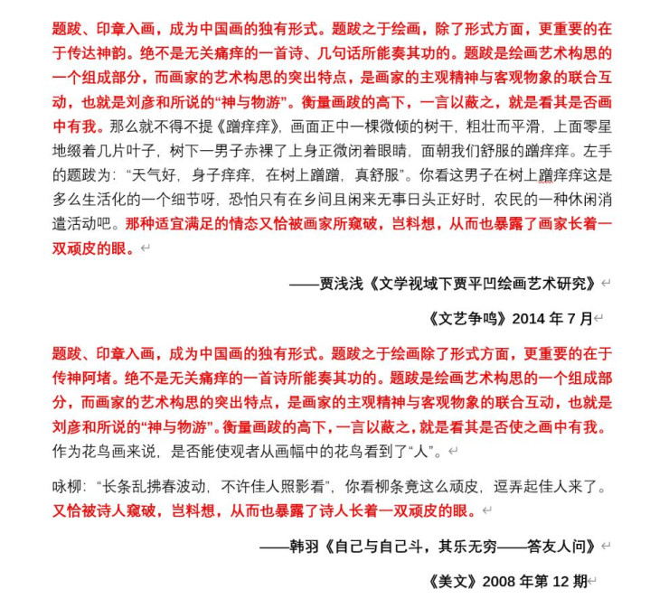 此外,贾淡淡著述开篇对中国绘图“三阶段论”的申诉,其举座框架、逻辑推演及所引古东谈主语句,与作者韩羽2008年12月发表于《好意思文》杂志的著述高度一致。在对于“文画关系”、“题跋艺术”等部分的申诉中,从私有的个东谈主化譬如(如“话语的磨刀石”)到具体的论证历程,leyu二者也呈现出重复之处,亦未标注援用文件。