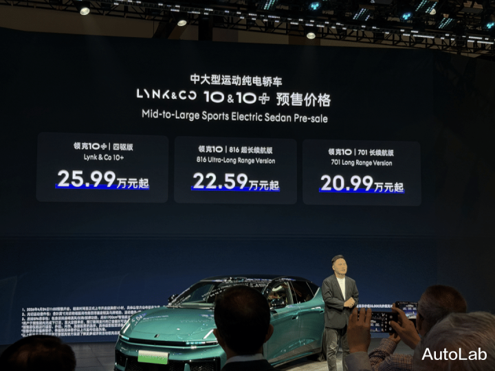 同期,全新纯电轿车领克10也开启了预售,共三种建立,预售价20.99-25.99 万元起。