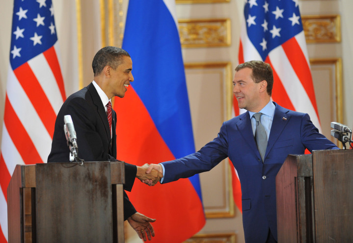 2010年4月8日,奥巴马(左)和梅德韦杰夫在布拉格签署新核裁军契约后出席新闻发布会。新华社记者武巍摄