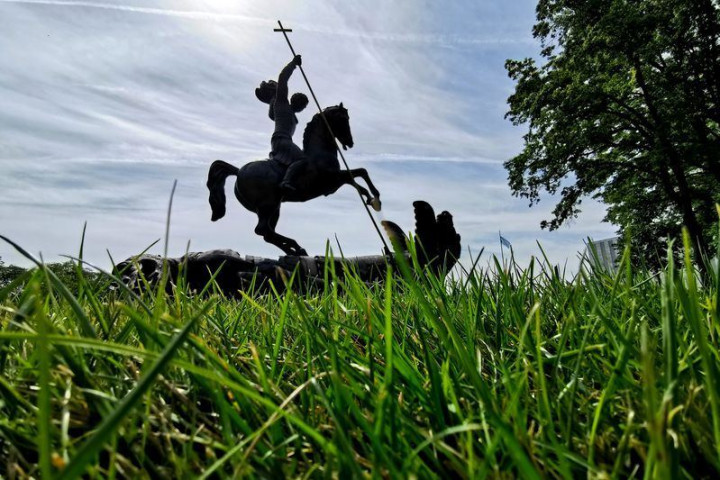 2019年8月5日,纽约麇集国总部的“善战胜恶”雕刻。该雕刻于1990年由苏联为顾忌《中导契约》签署和麇集国设立45周年挽救给麇集国。新华社记者李木子摄