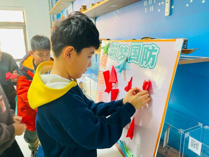 紧接着来到暖心互动才能,孩子们亲手折叠红色纸飞机,在寓意爱国诚实的红色机身上精采写下对故国的好意思好传话,以及立志好学、报効国度的成长筹画,完成创作后逐个粘贴至主题展板,汇注成一面满载少岁首心的国防心愿墙,红色承载的爱国情愫很是明显。