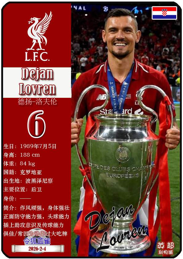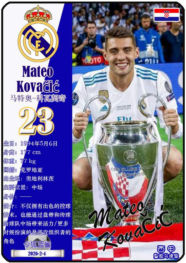 2018年俄罗斯宇宙杯淘汰赛阶段,领有莫德里奇、拉基蒂奇的克罗地亚队先后征服丹麦、俄罗斯、英格兰,最终于决赛2-4不敌法国队夺得本届宇宙杯亚军。本期以球星卡的体式清点2018年俄罗斯宇宙杯克罗地亚队23东说念主(按畴前球员所属俱乐部分类排序):