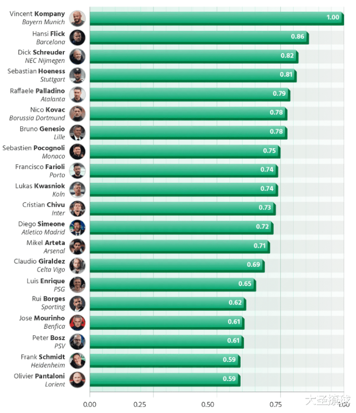 -德甲主帅在榜单中上风明显:孔帕尼之后次序是霍伊内斯(斯图加特,0.81)、科瓦奇(多特蒙德,0.78)和克瓦斯诺克(科隆,0.74)。