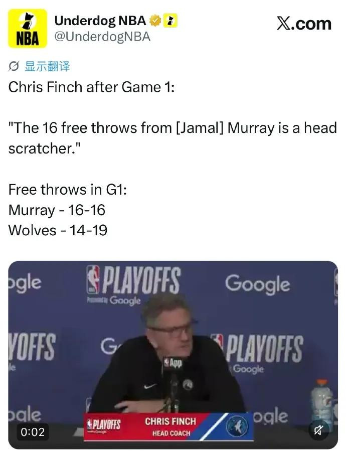 丛林狼主帅芬奇倒是对穆雷16次罚球相配发火,宣称这令东说念主浑沌。