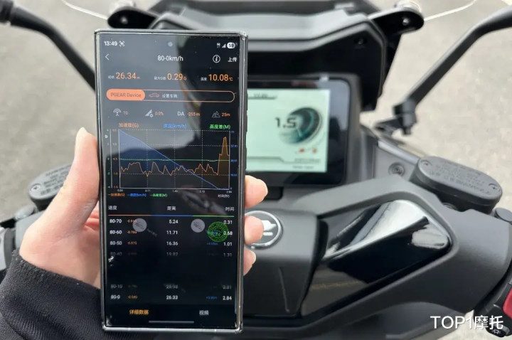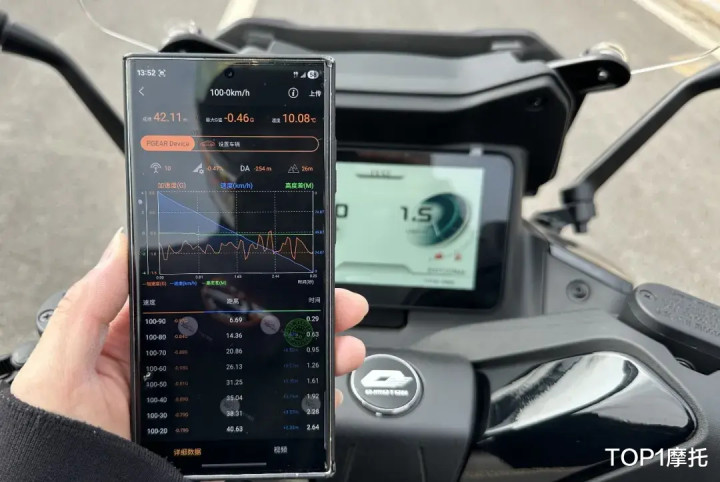 本次测试环境温度10.08°,油箱容量一格,小编体重69kg,实测鸿350GS的零百加快最好收货为8.77秒,其中0-30km/h加快用时1.33秒,0-50km/h加快用时2.46秒,0-80km/h加快用时5.37秒,0-90km/h加快用时6.89秒。这个零百加快收货进展,参考机车圈加快名次榜,简直与本田NSS350(8.7s)保持一致。