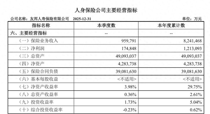 近日,盟国东谈主寿保障有限公司(以下简称“盟国东谈主寿”)公布2025年第四季度偿付智商讲述摘记。讲述显露,盟国东谈主寿2025年第四季度完毕保障业务收入95.98亿元,较2024年同时的94.17亿元加多1.81亿元,同比增长1.92%;完毕净利润17.48亿元,较2024年同时的38.16亿元减少20.68亿元,同比着落54.19%;2025年概述投资收益率仅为0.62%,2024年该数据为13.90%。
