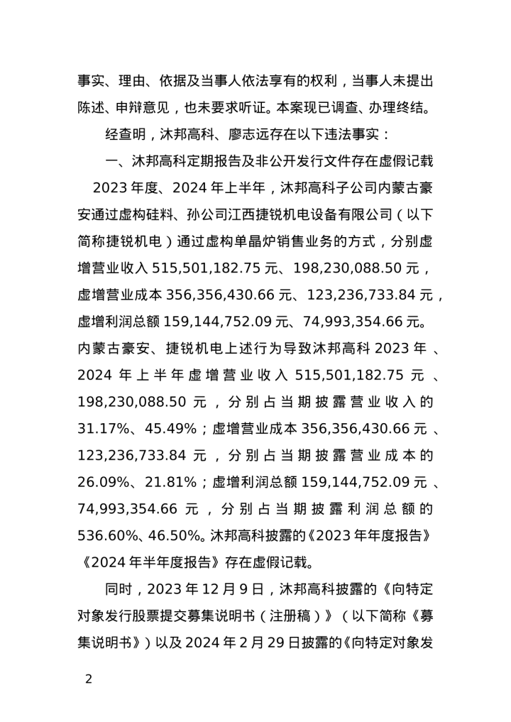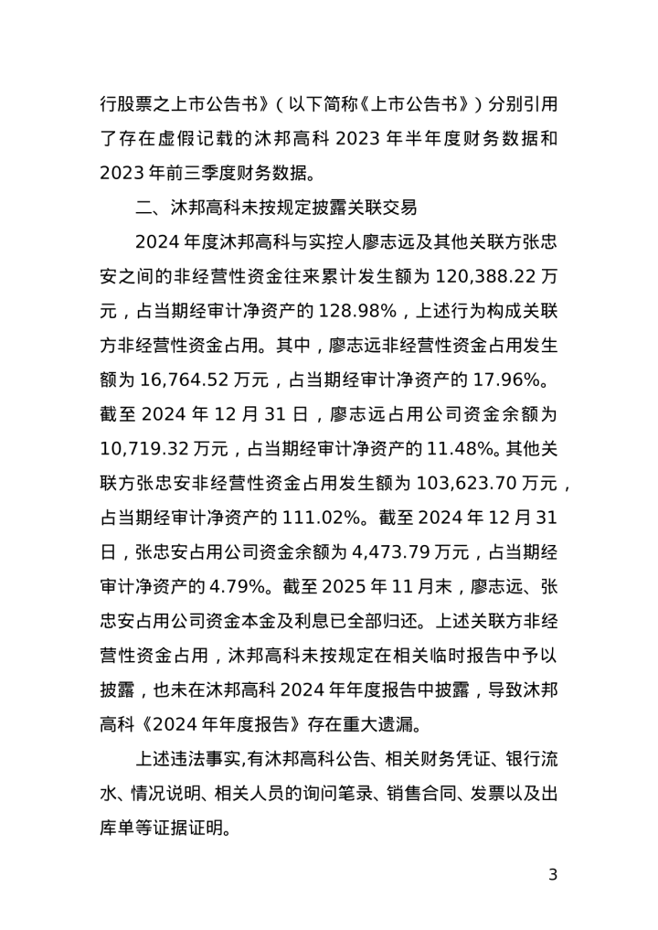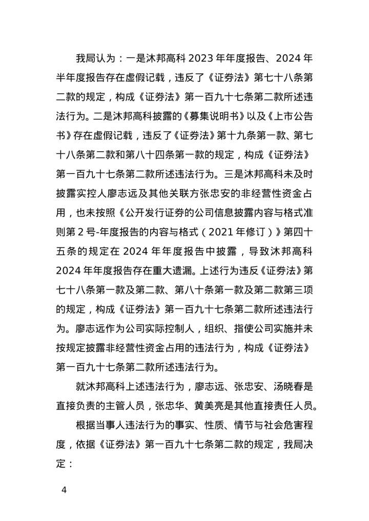 决定书表现,沐邦高科存在以下不法事实:一是沐邦高科2023年年度讲解、2024年半年度讲解存在弱点纪录,违犯了《证券法》的划定。二是沐邦高科透露的《召募阐扬书》以及《上市公告书》存在弱点纪录,违犯了《证券法》的划定。三是沐邦高科未实时透露实控东谈主廖志远偏激他相干方张忠安的非观念性资金占用,也未按照《公建立行证券的公司信息透露内容与要领准则》的划定在2024年年度讲解中透露,导致沐邦高科2024年年度讲解存在紧要遗漏,上述行为违犯《证券法》的划定。