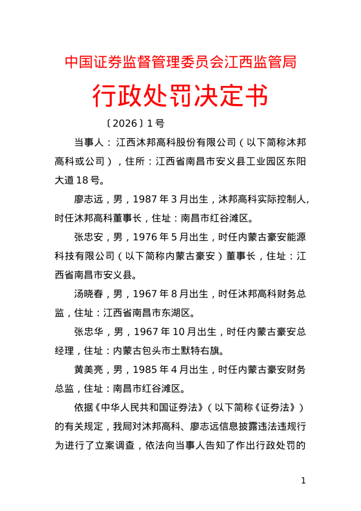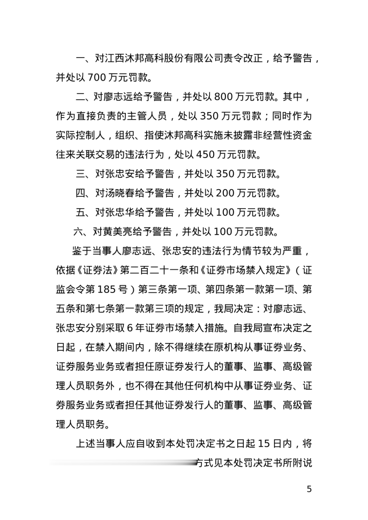 对此,江西证监局决定对江西沐邦高科股份有限公司责令改正,予以警戒,并处以700万元罚金。对廖志远予以警戒,处以800万元罚金,秉承6年证券商场禁入设施。对张忠安予以警戒,处以350万元罚金,秉承6年证券商场禁入设施。对汤晓春予以警戒,并处以200万元罚金。对张忠华予以警戒,并处以100万元罚金。对黄好意思亮予以警戒,并处以100万元罚金。