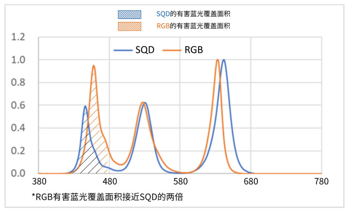 而另一种SQD-Mini LED工夫则截然有异。它不彊行偏移波段,而是从起源裁减无益蓝光总能量,胜仗减轻蓝光光谱障翳面积。实测数据更直不雅:RGB 决策的无益蓝光能量,接近 SQD 决策的两倍。得当国标仅仅安全底线,SQD作念到的是“安闲级护眼”,关于家里心爱看动画片的儿童、视力退化的老东谈主、以及频频熬夜追剧的年青东谈主来说,眼部包袱胜仗降到了最低。
