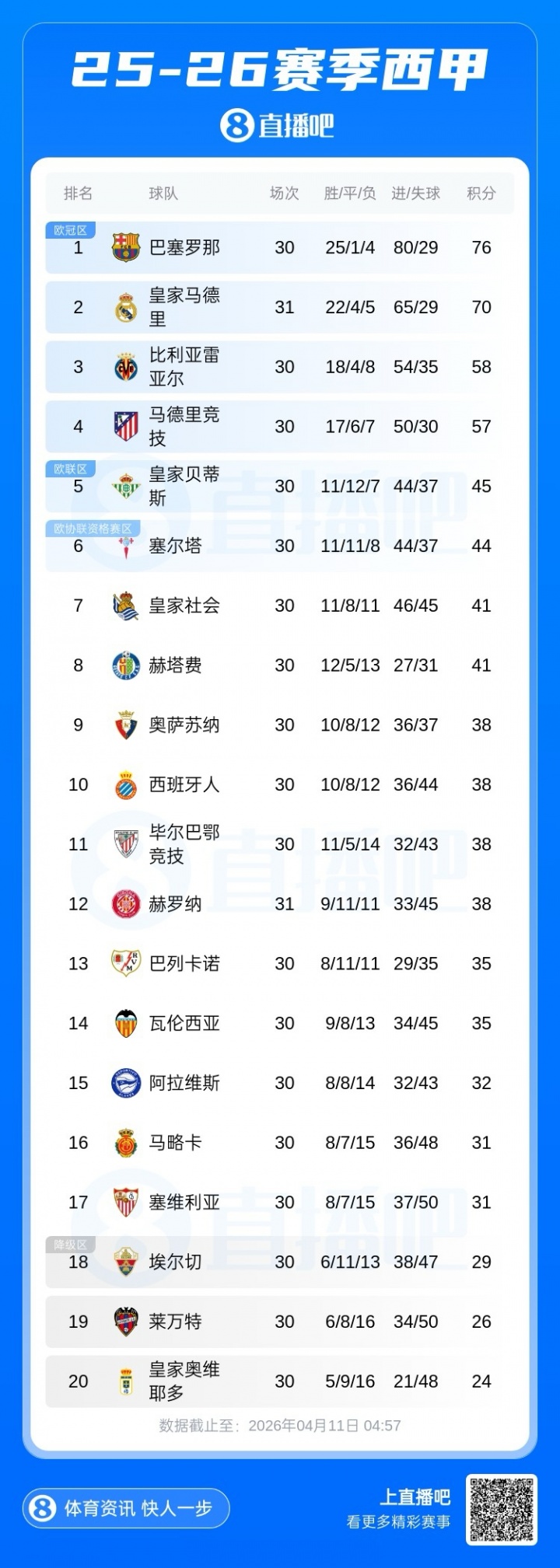 星空 还剩7轮!西甲积分榜:皇马先赛距榜首6分,巴萨将战西班经纪东说念主 发布日期:2026-04-11 06:42 点击次数:161 04月11日讯 西甲第31轮,星空app皇马主场1-1战平赫罗纳。皇马联赛2轮不堪,先赛距榜首6分。巴萨明日将主场迎战西班经纪东说念主。星空 开云官方体育app官网 西甲 星空 积分榜 7轮 还剩 上一篇:星空 羽毛球亚锦赛:王祉怡2-0郡司莉子 晋级女单半决赛 下一篇:没有了