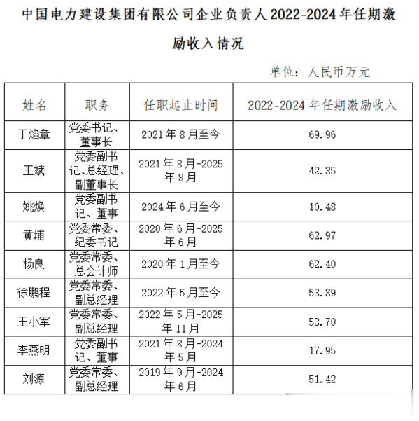 中国电力建树集团有限公司企业矜重东说念主2022-2024年任期激勉收入情况