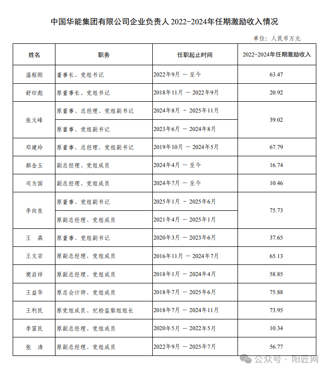 中国华能集团有限公司企业矜重东说念主2022-2024年任期激勉收入情况