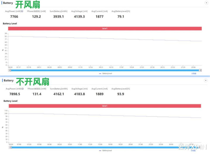 除了这点,我们通过 Perfdog 的数据还发现,开电扇时的整机功耗为 7.8W,对比不开电扇时的 7.9W,其实并莫得多大差距。