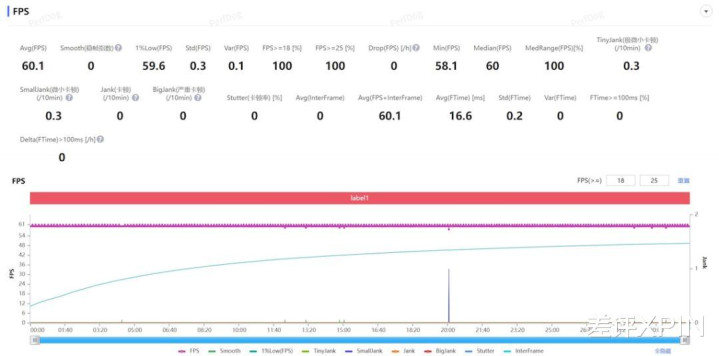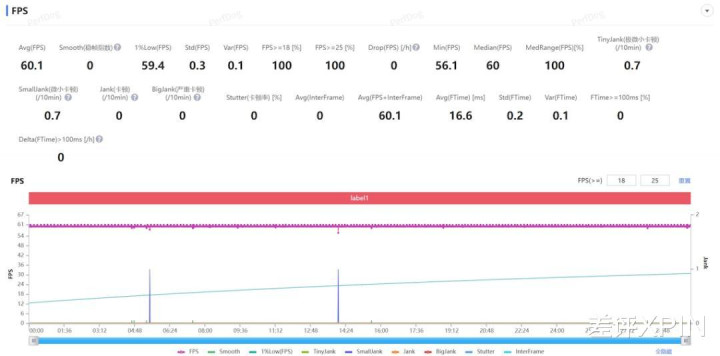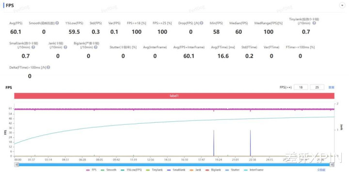 不错看到,iQOO 15 Ultra 跑出来的平均帧依旧有 60.1 帧,依旧是一条水平的直线,1% Low 帧致使有 59.6 帧。