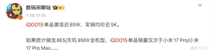 而关于 iQOO 来说,他们的底气来自于 iQOO 15 的卖爆,而且实销均价依然快 5 千。