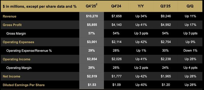 翻开AMD财报,咱们先来看几项最要津的信息。起初是营收,AMD2025Q4获取了102.7亿好意思元,同比增长34%;2025全年,AMD的营收达到了346.4亿好意思元,同比涨幅亦然34%,这两项数据均创下AMD历史新高。