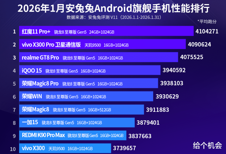 如上图所示,排行前十的手机折柳是红魔11 pro+、vivo x300 pro 卫星通讯版、realme真我GT 8 pro、iqoo 15、荣耀magic 8 pro、荣耀WIN、荣耀magic 8、一加15、红米k90 pro max、vivo x300。