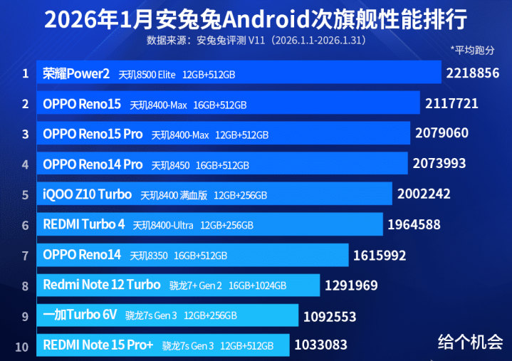 安兔兔还发布了次级旗舰性能排行,前十的名单折柳是荣耀power 2、oppo reno 15、oppo reno 15 pro、oppo reno 14 pro、iqoo z10 Turbo、红米Turbo 4、oppo reno 14、红米note 12 Turbo、一加Turbo 6v、红米note 15 pro+。
