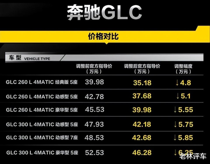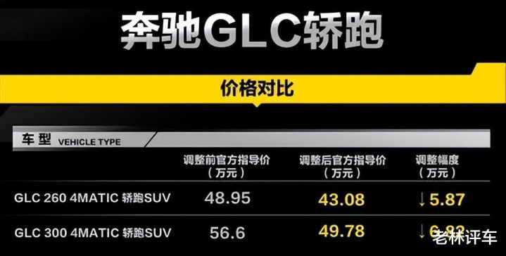 GLC 260降价5.87万元,价钱形成了43.08万元,GLC 300降价6.82万元,价钱形成了49.78万元。