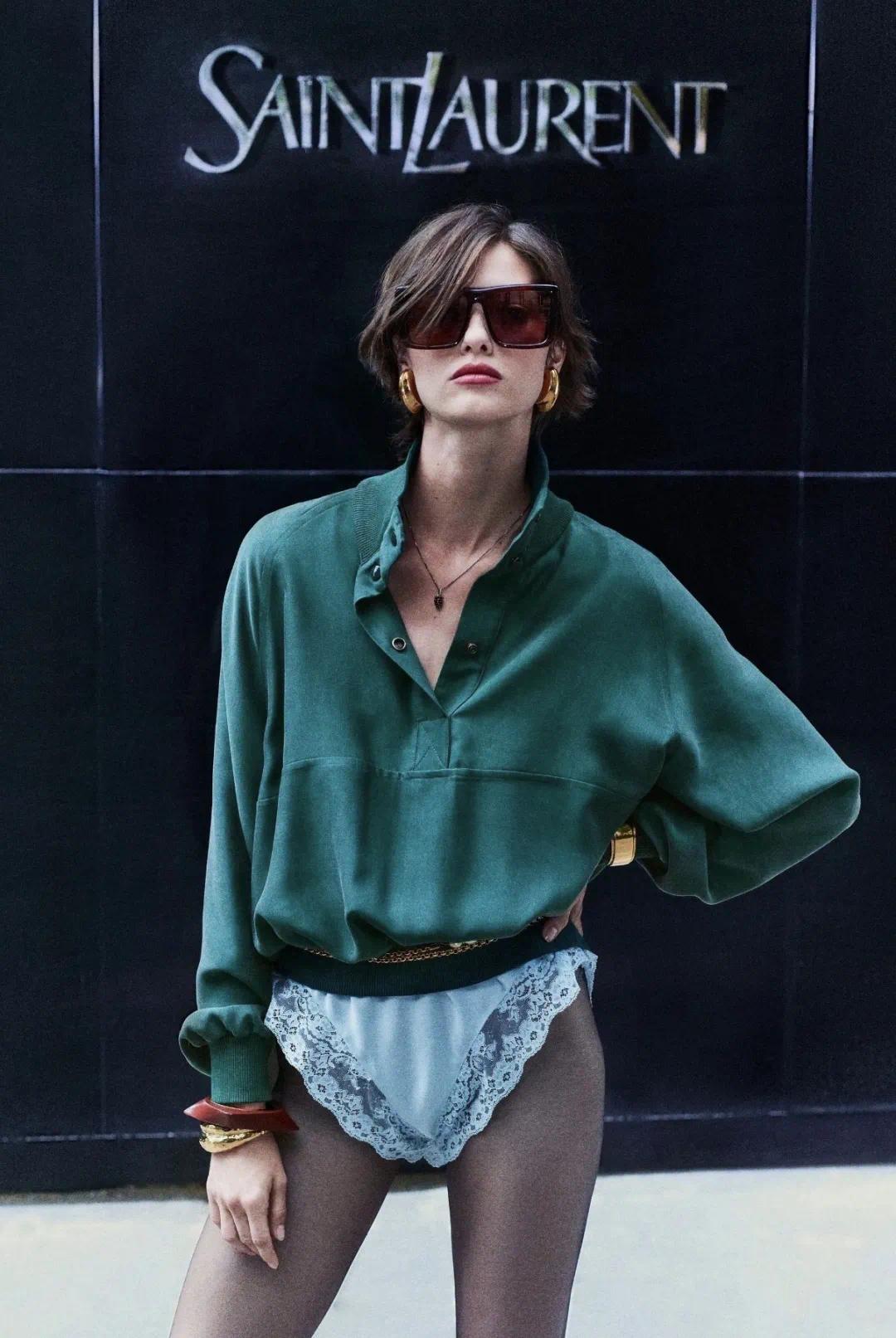 Saint Laurent则用畅通裤配缜密衬衫、畅通鞋